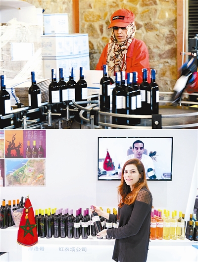 这是一张拼版照片。上图为:10月1日,在摩洛哥小镇鲁马尼,红农场酒庄的工作人员将灌装好的葡萄酒进行装箱(新华社记者陈斌杰摄)。下图为:11月7日,在首届中国国际进口博览会上,摩洛哥红农场公司员工穆娜展示参展的葡萄酒(新华社记者孟鼎博摄)。