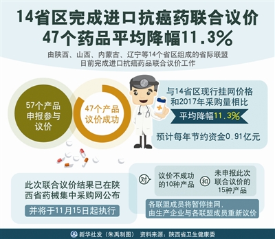 14省区完成进口抗癌药联合议价 47个药品平均降幅11.3%