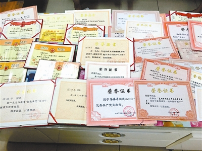 汤家祖孙三代人获得的奖状和证书。 本报记者 庞慧敏 摄