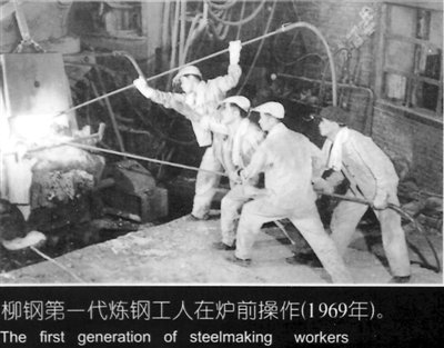 1969年,柳钢第一代炼钢工人在炉前操作。受访者供图