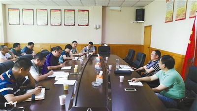 重庆市万州区总工会党组书记、常务副主席吴明国(左六)与驻村干部一起研讨脱贫攻坚工作