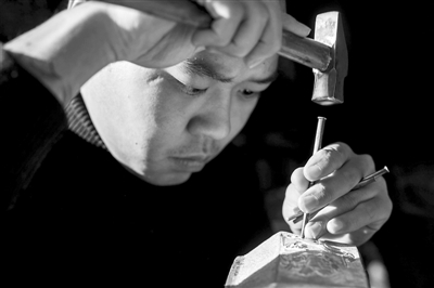 在云南省鹤庆县新华村,一名工匠在加工工艺品(11月8日摄)。