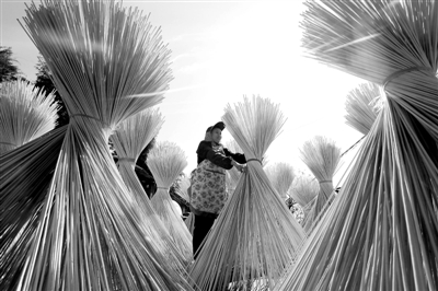 贵州省赤水市复兴镇太和村的一名村民在晾晒竹丝(10月31日摄)。