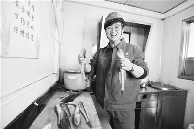 “午饭除了炖鸡、西红柿炒鸡蛋,我们还有鱼吃,看,这是新鲜的……”11月1日,在冀东油田高88-28井作业现场的板房内,井下作业公司试油12队技术员钮宁手抓着两条黑头鱼高兴地说道。