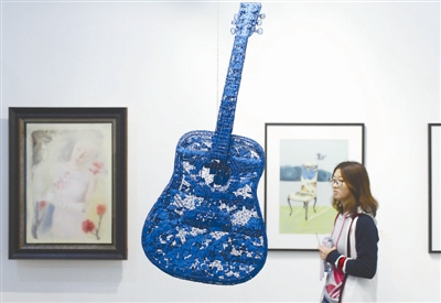 11月7日,一名观众在观看一把用不锈钢丝制作的“蓝色吉他”。当日,2018第二十二届上海艺术博览会在上海世博展览馆开幕。来自国内外的近120家艺术机构展出了包括绘画、雕塑、装置、影像等门类逾5000余件艺术作品。