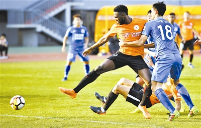 11月11日15时,北京丰台体育中心体育场,北京人和队主场0比0战平广州富力队。图为人和队外援尼扎木丁门前射门。本报记者 许之丰 摄
