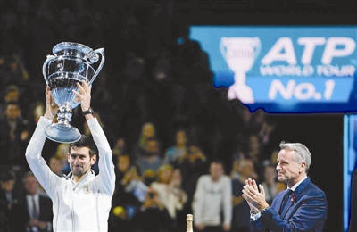 11月11日,德约科维奇(左)展示年终世界第一奖杯。