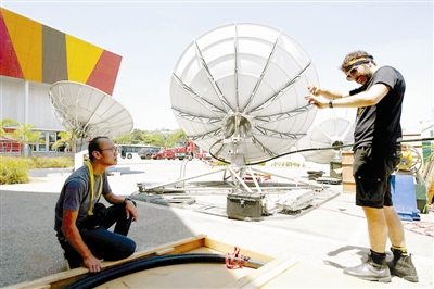 11月13日,工作人员在巴布亚新几内亚首都莫尔兹比港的APEC国际媒体中心安装卫星设备。 APEC第二十六次领导人非正式会议将于11月17日至18日在莫尔兹比港举行。 新华社记者 吕小炜 摄