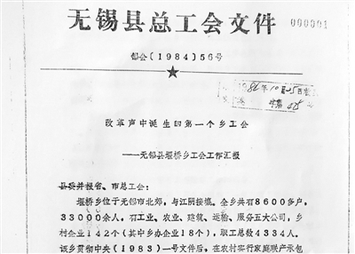 “源于农,已姓工”。调查有了发言权。无锡县总工会认为,乡镇企业应该也可以建工会,乡镇企业职工可以加入工会。县总工会随即向县委和无锡市总工会写了报告,经县委和上级工会批准:抓乡镇企业建工会试点!