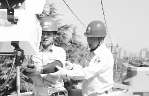 在一个炎热的夏日午后,一辆黄色的绝缘斗臂车支撑在仿佛要被太阳烤化了的柏油路上。顺着刺眼的阳光抬头望去,绝缘工作斗中有一名不停电作业人员有条不紊地进行着作业。