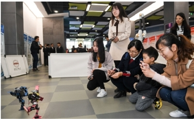 11月11日,在合肥工业大学翡翠湖校区,人们在观看该校计算机与信息学院学生展示的舞蹈机器人。