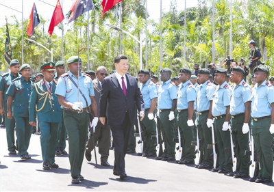 11月16日,国家主席习近平在莫尔兹比港会见巴布亚新几内亚总督达达埃。会见开始前,达达埃在议会大厦前广场为习近平举行隆重欢迎仪式。