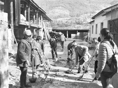 11月15日,金沙江堰塞湖洪峰过后,云南丽江市玉龙纳西族自治县塔城乡居民在清理街头淤泥。