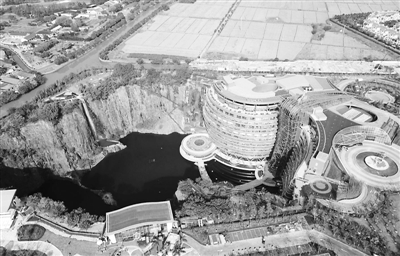 位于上海松江的世茂洲际酒店11月15日正式开门营业。这家在一个废弃采石矿坑内建成的酒店成为上海又一新景。图为无人机拍摄的世茂洲际酒店。