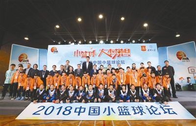 参加中国小篮球论坛的嘉宾与小学生代表在活动结束后合影。新华社发