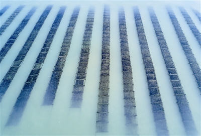 近日,福建省各地陆续进入紫菜采收季节。在福建省石狮市,待收的紫菜在涨潮的海面上若隐若现,形成独特的景观。