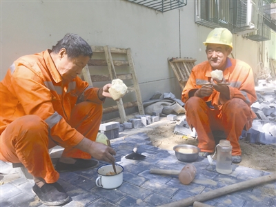 “其实我们是有食堂的,只是出来施工,距离太远。”李国强告诉《工人日报》记者,工地食堂在距施工路段7公里外的禄长街上。目前,他们的午餐是由单位食堂做好,送到施工现场来的。午饭供应馒头和一个菜,“能保证基本需要,想吃多少就能吃多少。只是菜品太少了,通常一天白菜一天土豆,交叉替换。”