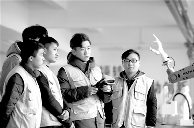 11月21日,山东邹城,在山东省智能机器人应用技术研究院,大学生在实习操作机器人机械手臂。近年来,邹城加速新旧动能转换,把发展高端装备制造业作为突破口,打造了集技术研发、配套服务、企业孵化为一体的专业化园区。本报记者 杨登峰 摄