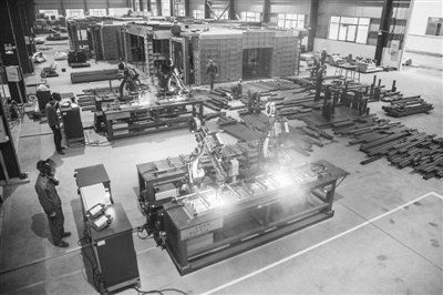 近日,北京中铁建建筑科技有限公司铝模事业部湘潭生产基地迎来了4名新“同事”——高智能自动化焊接机器人。焊接机器人每台每天可完成240平方米标准板的焊接任务,效率是人工的5~6倍。近年来,该公司不断加大科技创新力度,通过自主研发的云平台,实现了施工现场数据的自动化、移动化的收集与管理,实现了施工项目的科学化、现代化管理形态。图为工人正在调试焊接机器人。本报记者 王伟伟摄