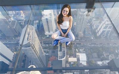 11月21日,泰国曼谷,曼谷地标建筑王权云顶大厦的全新空中玻璃步道对外开放,游客在步道上可以360度俯瞰曼谷全景。王权云顶大厦高314米,共78层,是泰国第一高楼。