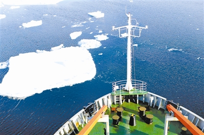 当日凌晨,在多次与漂浮在南大洋上的冰山“相会”后,中国第35次南极科学考察队搭乘的“雪龙”号极地科考船在南纬61度55分、东经110度37分附近驶入浮冰区。