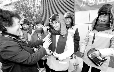 11月24日,江苏徐州鼓楼区黄楼街道万通社区党委联合区域单位党组织和辖区老党员开展给环卫工人送温暖活动,给环卫工人送去爱心手套、围巾、保温杯等御寒用品,并体验环卫工作。蒯创 邵俊子 摄