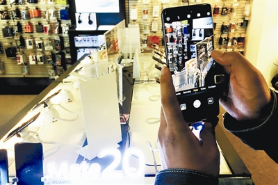 11月25日,顾客在西班牙巴塞罗那的一家电子用品商场体验华为新款手机的拍照功能。中国品牌逐步在西班牙市场建立起良好形象。 新华社记者 郑焕松 摄