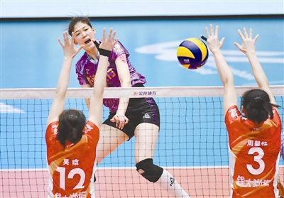 11月24日,天津渤海队球员李盈莹(中)在比赛中扣球。
