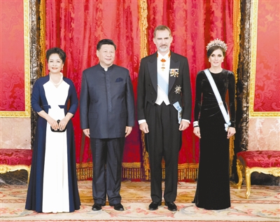 晚8时许,习近平和夫人彭丽媛抵达马德里王宫,费利佩六世国王和莱蒂西娅王后热情迎接。两国元首夫妇握手合影,随后同出席欢迎宴会的中西两国来宾一一握手,互致问候。
