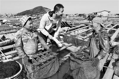 11月27日,福建省连江县安凯乡海上党支部纪检员杨光旭(中)在渔排上向党员黄兴喜(右)父子了解帮扶情况。