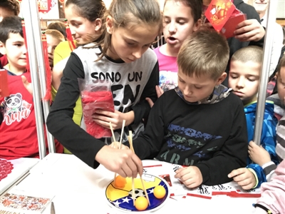 “中国百问百答”活动区是超级热点。一波波的孩子涌进来,争相到答题箱里取卡片答题。10岁的伊妮拉前后拿了3张卡片,填写的答案全部正确。在小册子上加盖3个印章后,她带着甜甜的笑容,又匆匆跑到筷子夹乒乓球活动区一试身手。