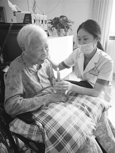 为提升基层康复服务能力,福建中医药大学附属康复医院近年来开展适宜技术应用培训,为社区康复服务落地建设提供技术指导、专家支持,并牵头成立福建省康复联盟,以“互联网+医疗”的服务模式,通过远程医疗、技术指导等形式,打破医疗服务“围墙”,增加联盟成员单位间的黏性,目前联盟成员单位已达100家。图为医护人员辅导失智老人吹蜡烛。 丁志山摄