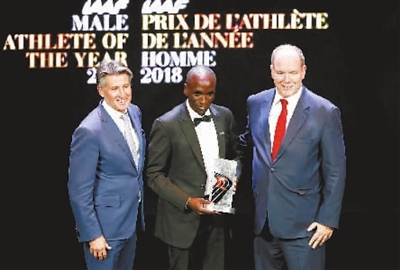 12月4日,年度最佳男运动员获得者、肯尼亚马拉松运动员基普乔盖(中)在颁奖典礼上。
