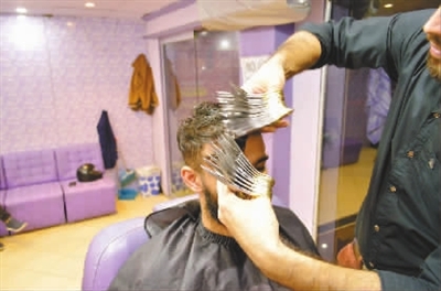 26岁的巴基斯坦理发师穆罕默德·阿瓦依思能同时用27把剪刀为顾客理发,神级操作让人惊叹不已。(东方IC)