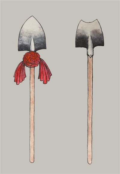 漫画家胡延亭先生上周寄给我一本他刚刚出版的个人作品集,给我留下深刻印象的一幅作品恰恰是两把铁锹,这便是今天要谈的漫画《阴差阳错》。铁锹本是寻根问底的工具,而这一次,疑问重重的问底工具也遇到了问题。其实问题并不复杂,这两把铁锹,谁的本事大?谁应该佩戴光荣花?