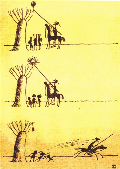 孩子们的气球飞到了树梢上,此时恰遇持竿的骑士,热心的先生伸手帮忙,不料弄破娃娃的玩具……唉,好心办了“错”事。