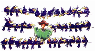 田间竖起一个稻草人,鸟儿面对不速之客惊诧不已,他们在“人”身上跳来跳去,问长问短。很快彼此成了无话不说的朋友。