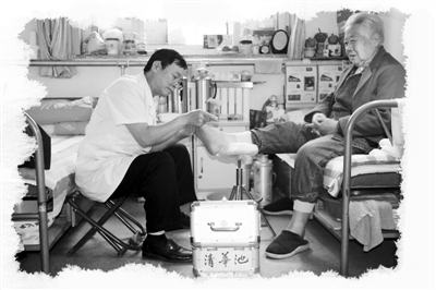 清华池修脚师李金明在为老人修脚。由于技艺精湛和多年坚持上门为老人服务,曾获全国五一劳动奖章。