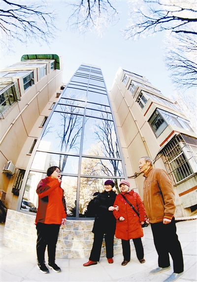 12月12日,北京市丰台区东高地街道梅源社区7号楼的居民在观看新安装的电梯。