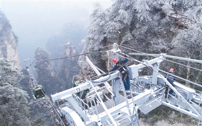 12月9日,受冷空气影响,湖南张家界武陵源风景区出现冰雪天气,当地旅游部门和景区企业加大对高空索道等游览运输工具的安全巡检力度,及时排除安全隐患,保障游览安全。图为黄石寨索道巡检工金二成(左)、陈宬在索道支架上进行巡检。