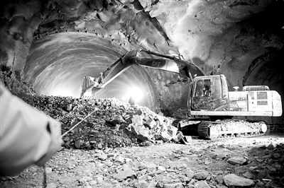 据了解,新八达岭隧道全长12.01公里,是京张正线十座隧道中里程最长、施工难度最大的隧道。图为工作人员正在隧道口清理碎石,平整路面。本报记者 王伟伟 摄