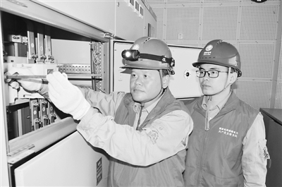 黄颂(左一)在馨福公寓配电房搬迁改造现场对设备进行检查