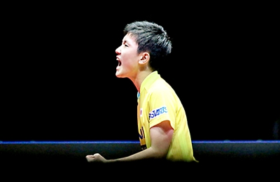 12月16日,张本智和在比赛中庆祝得分。 新华社记者 王婧嫱 摄
