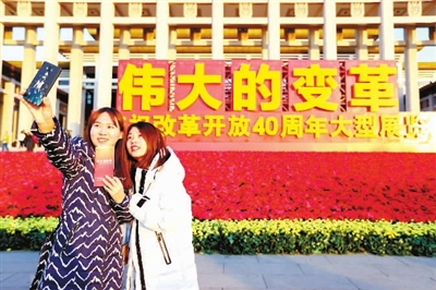 12月18日,参观者在“伟大的变革——庆祝改革开放40周年大型展览”外自拍留影。