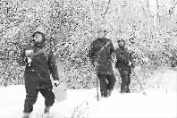 周红亮(图中)带领班组成员冒雪在秦岭深处110千伏硖黄Ⅱ线巡视线路