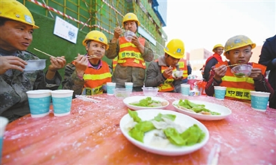 12月18日,长沙,众多建筑工人同吃“饺子宴”。当日,工地项目管理人员免费邀请100余位建筑工人品尝水饺,以此方式慰问工人,迎接即将到来的冬至。 杨华峰 摄/中新社