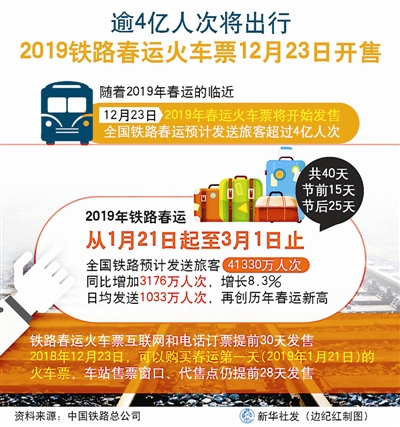 逾4亿人次将出行 2019铁路春运火车票12月23日开售