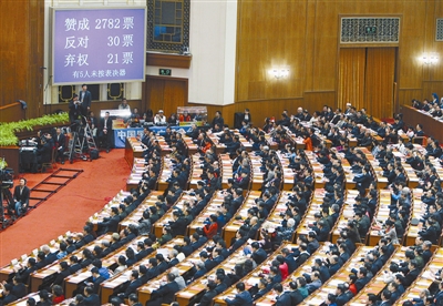 2017年3月15日上午9时,第十二届全国人民代表大会第五次会议在人民大会堂举行闭幕会。图为《中华人民共和国民法总则(草案)》表决结果。 本报记者 杨登峰 摄