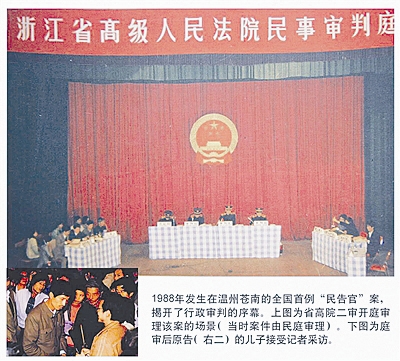 1988年,浙江省高院二审开庭审理发生在温州苍南的全国首例“民告官”案的场景。