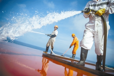 6月20日,渤海海域,金海发货轮上的水手们用高压水枪冲刷甲板。我国是世界海洋大国,但由于海上工作枯燥、艰苦,愿意当水手的年轻人越来越少,我国正面临着海员人才不足的挑战。